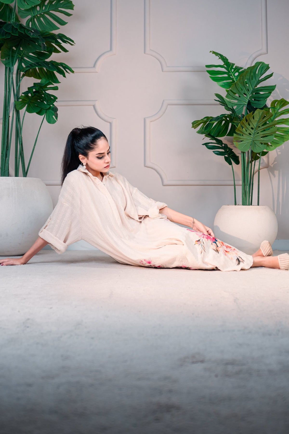 A long beige shirt with floral appliqué and mafia sleeves!