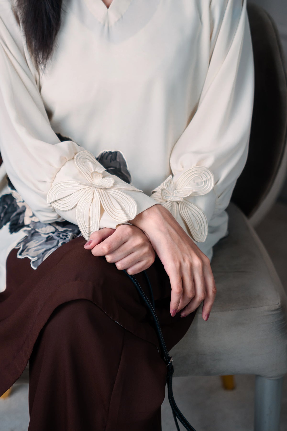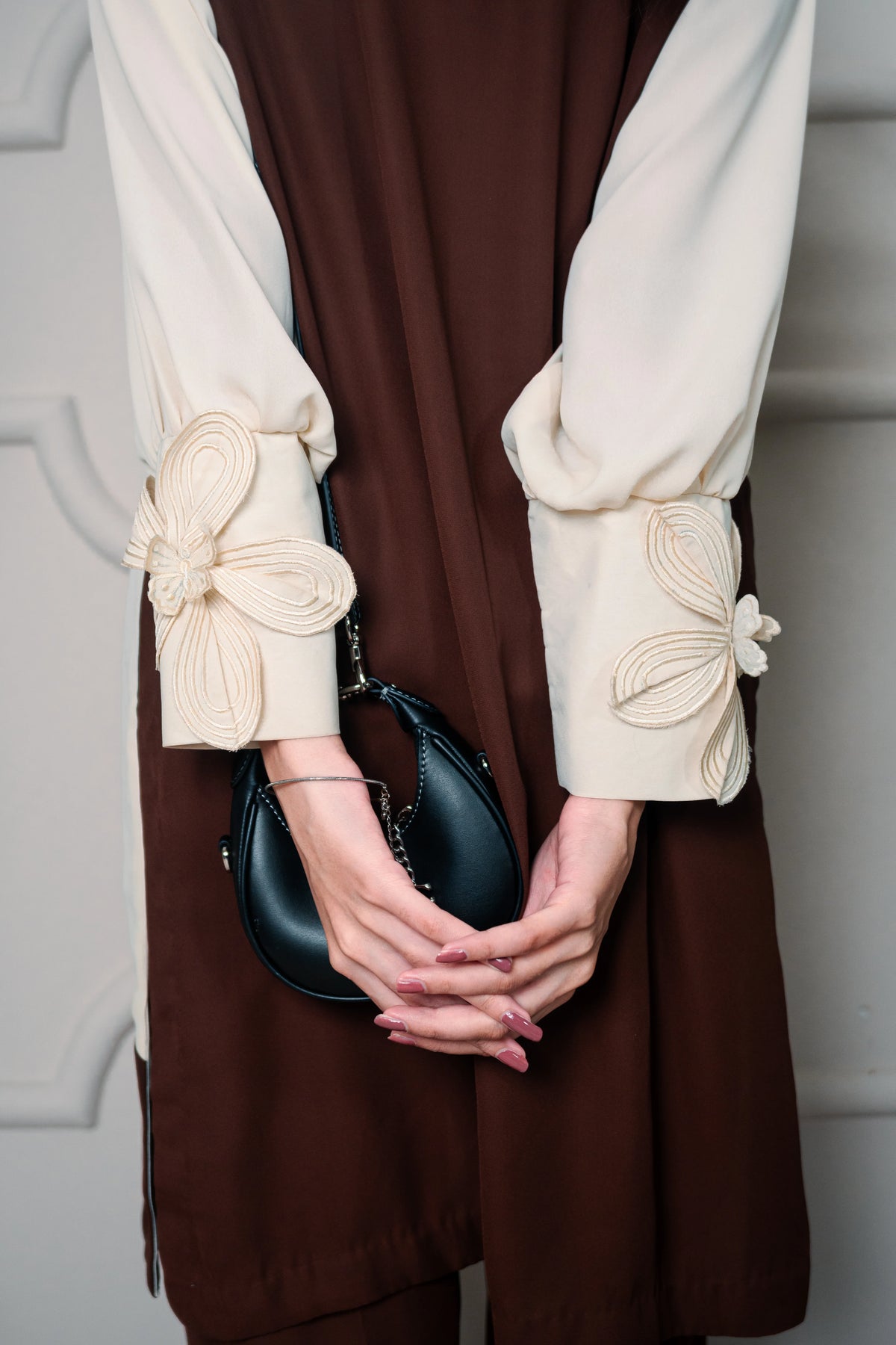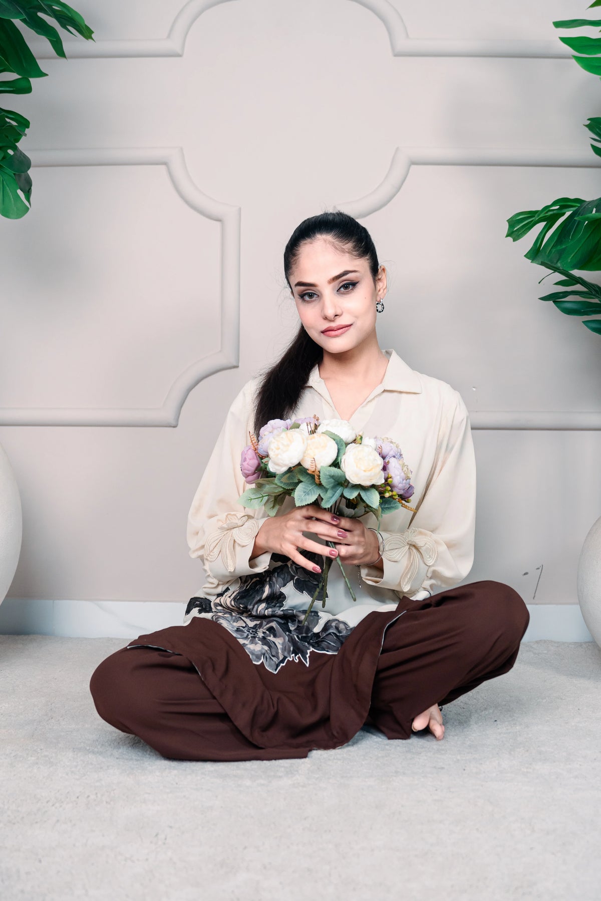 Elevate your festive and formal look with this beige and deep brown silk short shirt, beautifully adorned with black & white floral appliqué and statement sleeves. The contrast tones and bold detailing create a chic and modern look, perfect for special occasions.