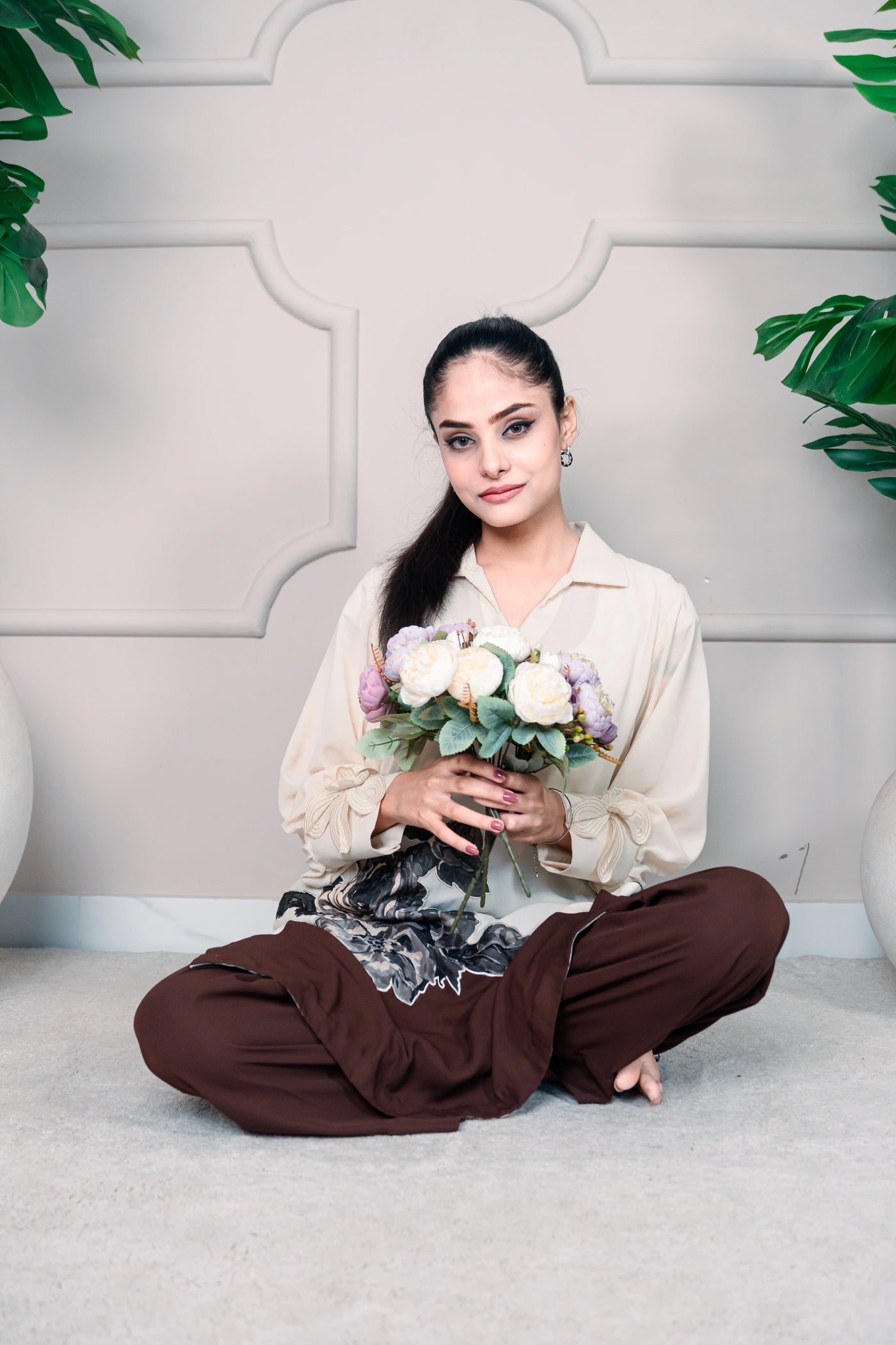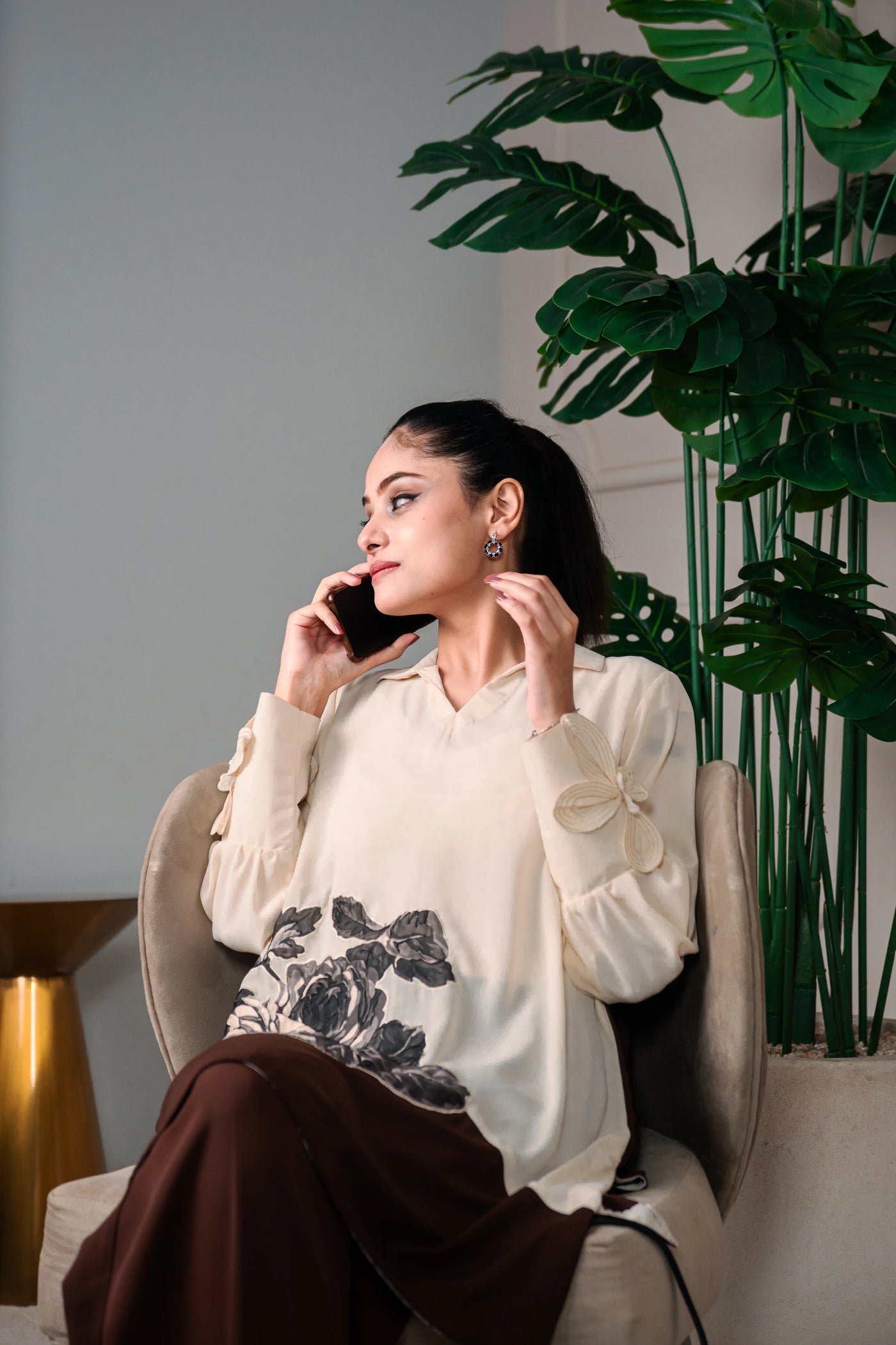 Paired with matching deep brown silk pants, tailored for a sleek, graceful, and comfortable fit that complements the short shirt effortlessly.