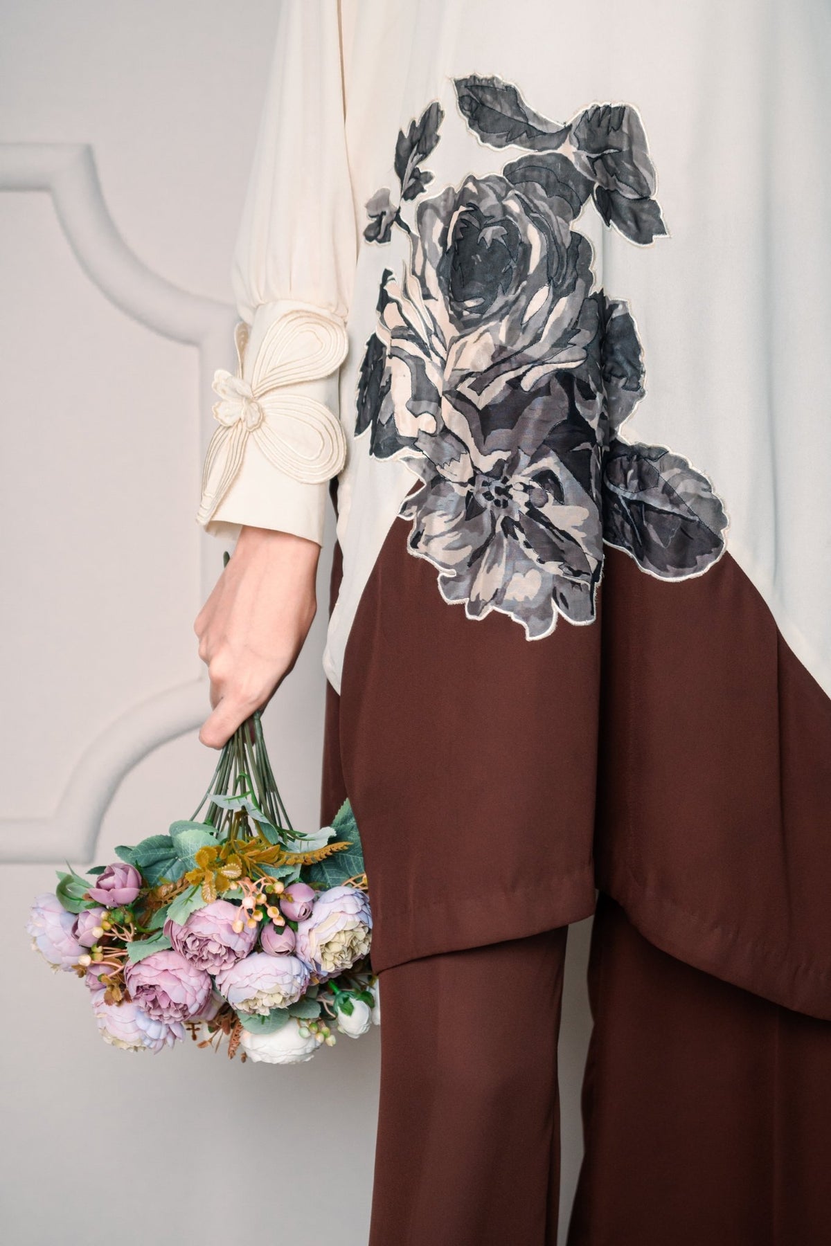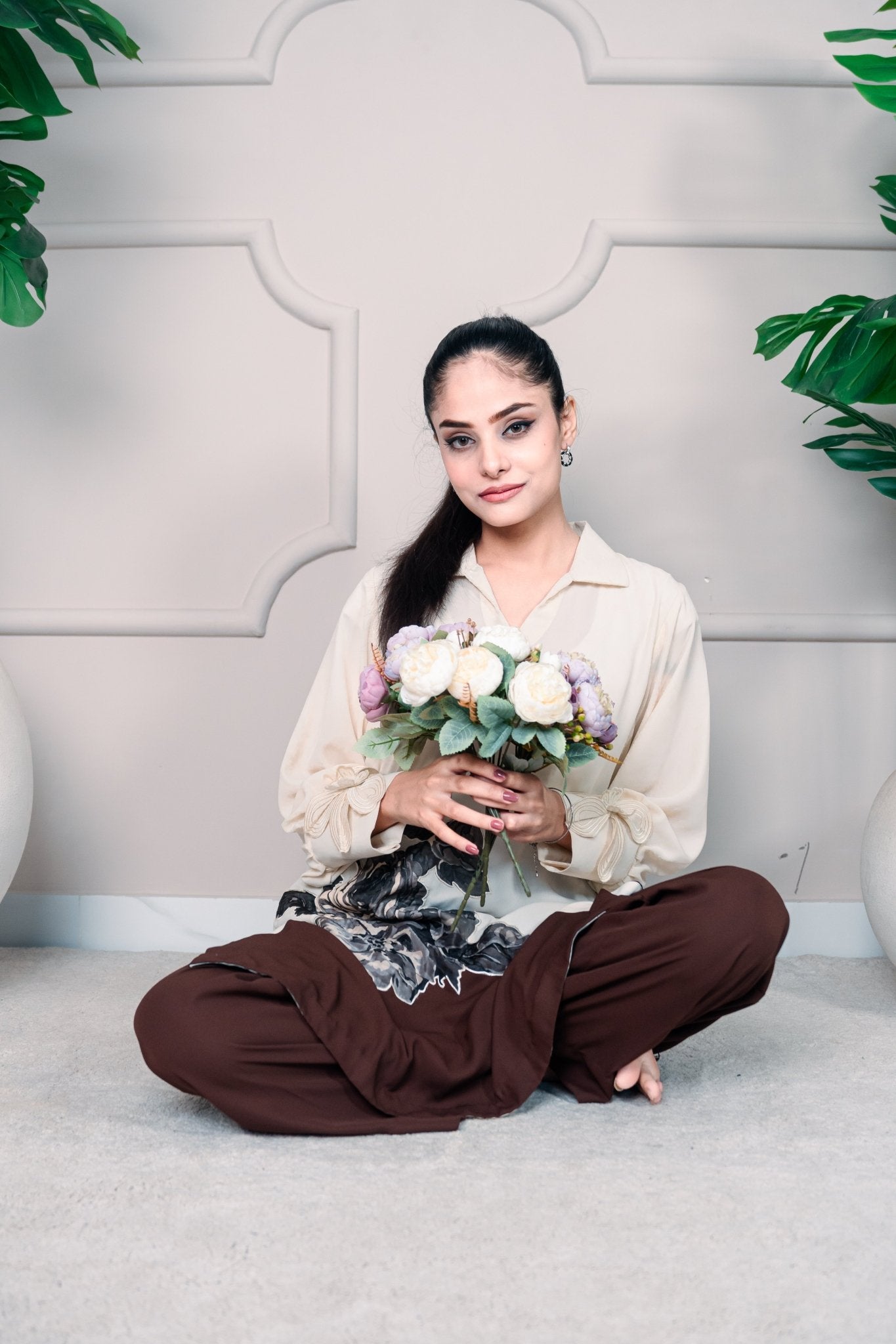 Beige and deep brown silk short shirt with black & white floral appliqué and statement sleeves, paired with matching brown silk pants.