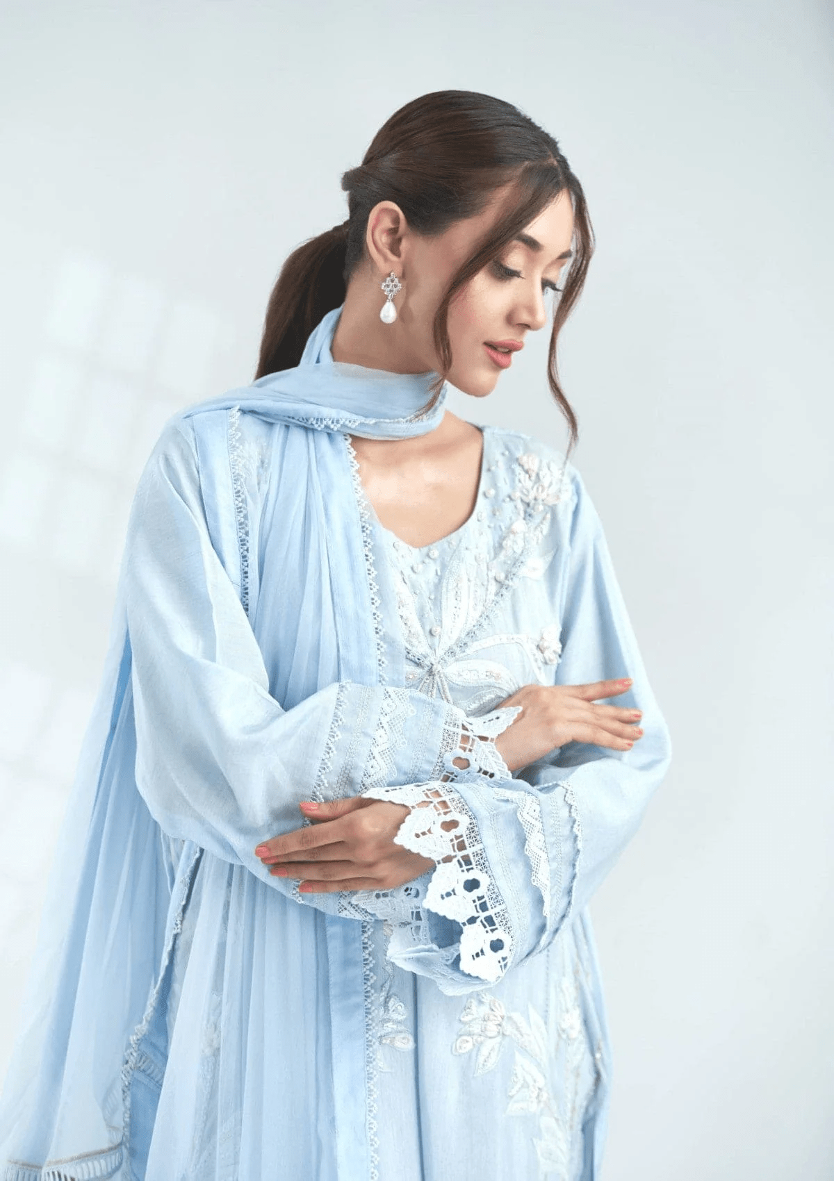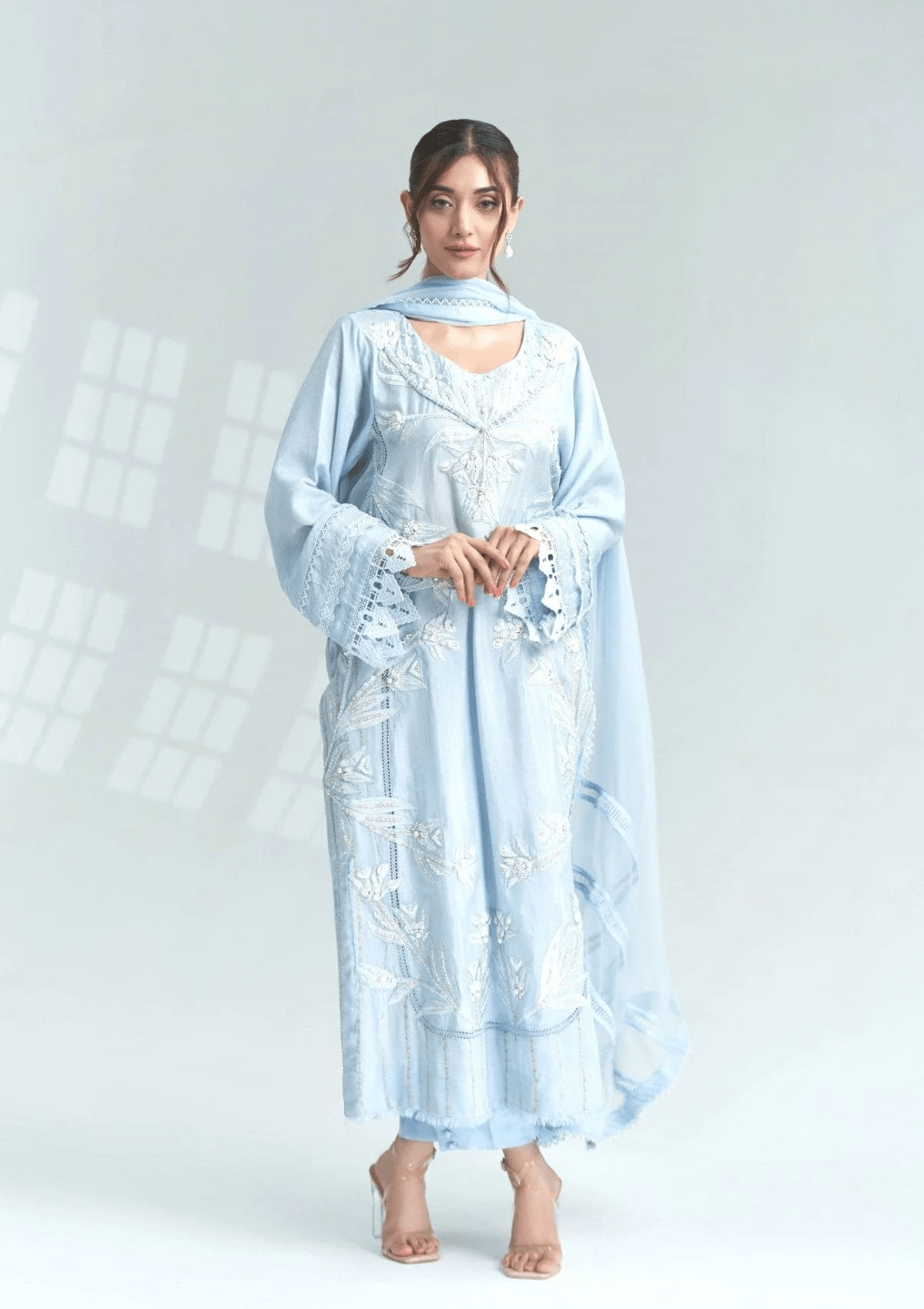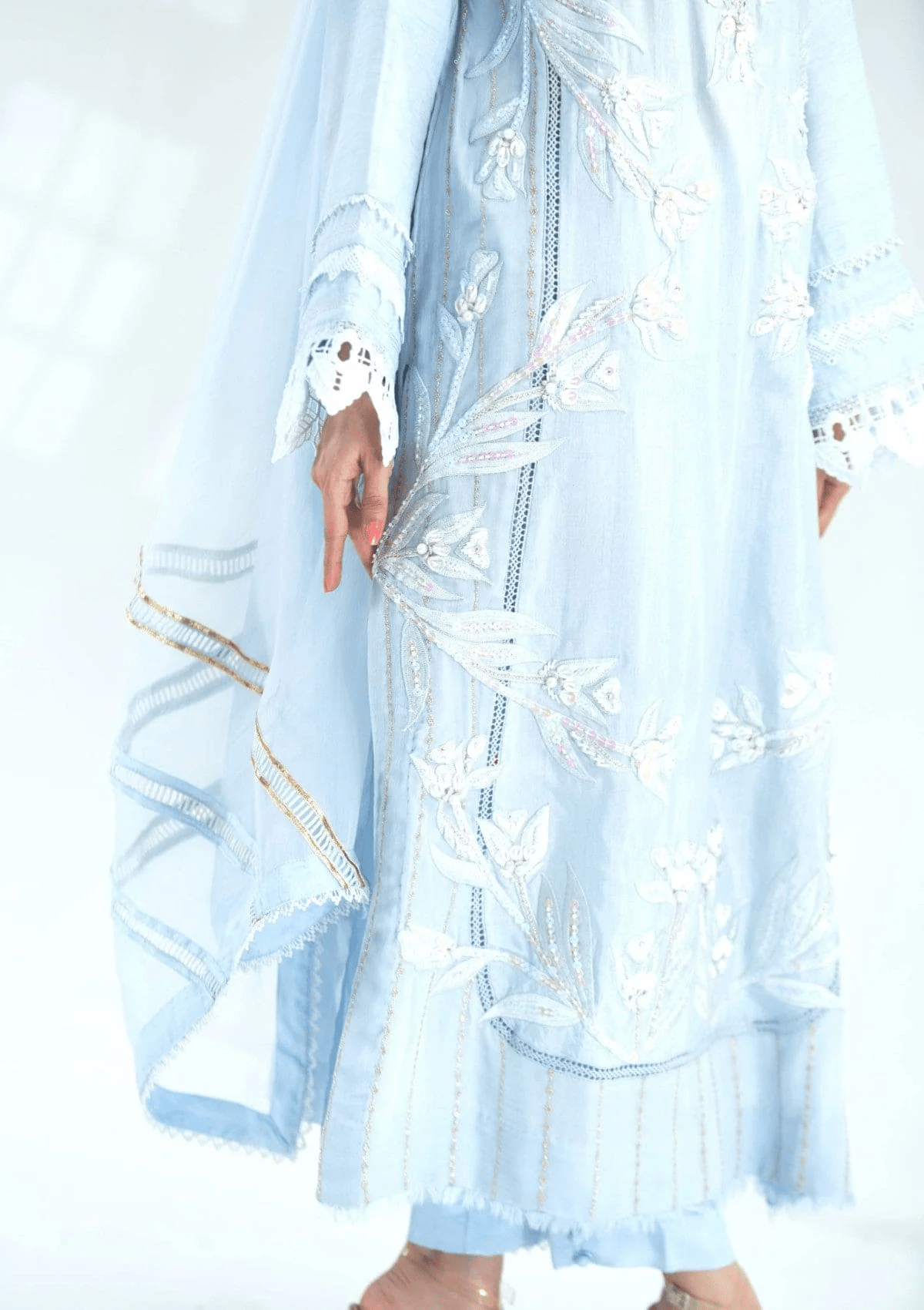 Neigecis an ice blue Korean raw silk shirt stylized with embroidery and embellishment Plain viscose Chiffon laced depot. Shirt: Korean raw silk Trouser: Plain viscose Dupatta: Chiffon