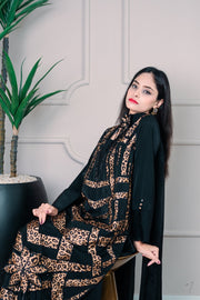 Black pure silk long shirt with tiger-print appliqué & black cut dana, plain silk trousers, and floral tiger-print clutch dupatta.