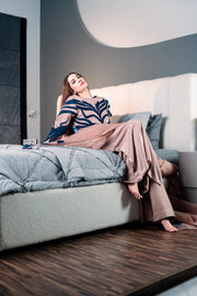 Paired with chic silk culottes, designed to provide a stylish yet comfortable fit that complements the long shirt effortlessly.