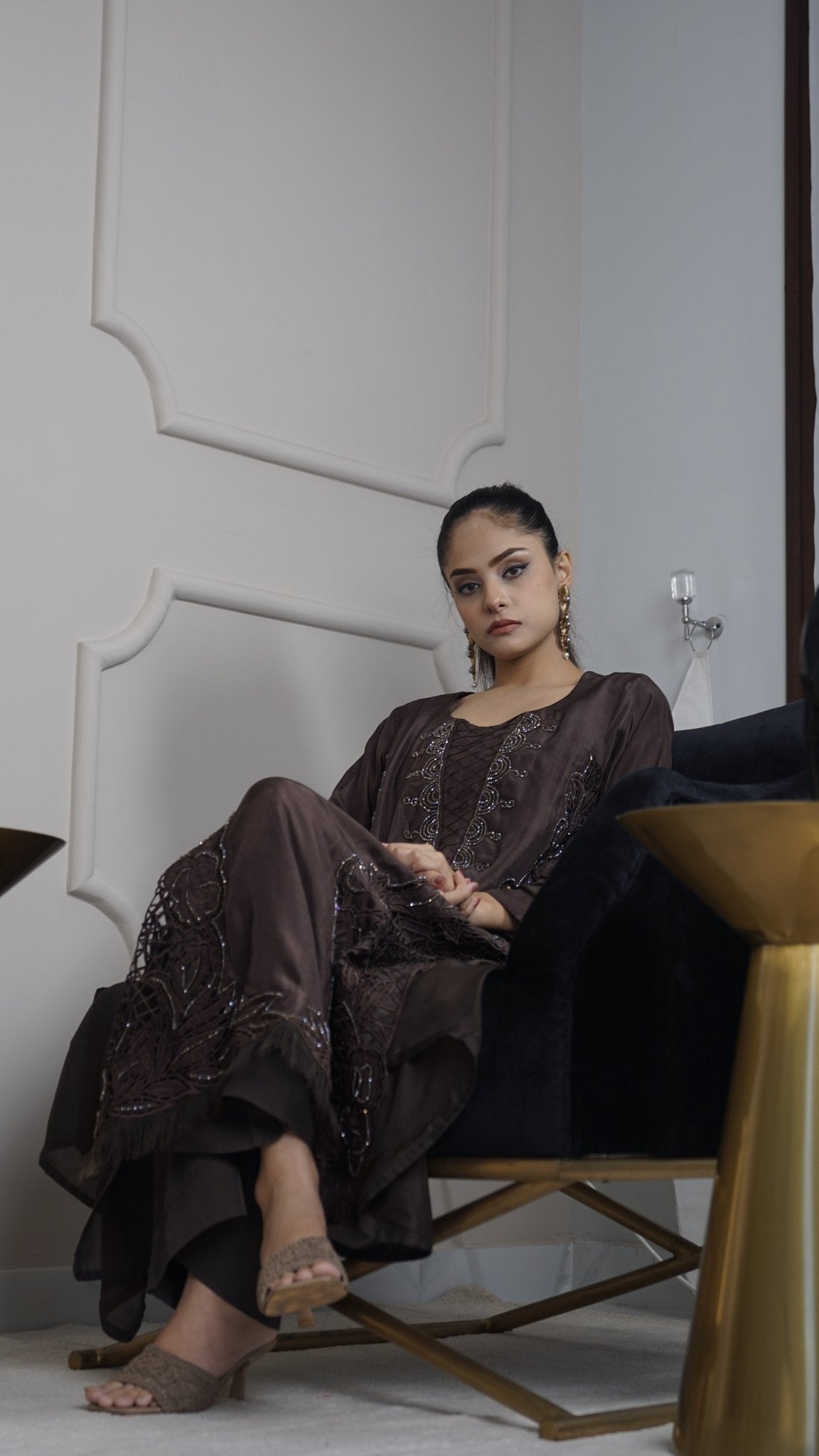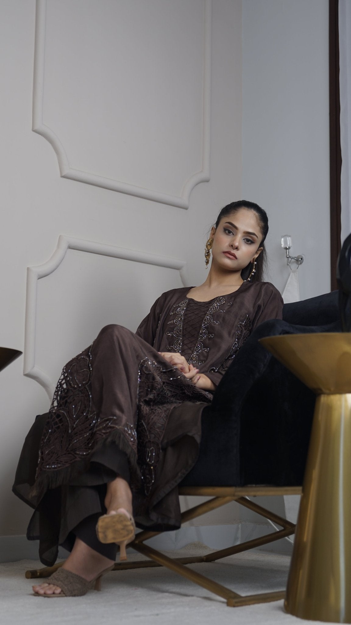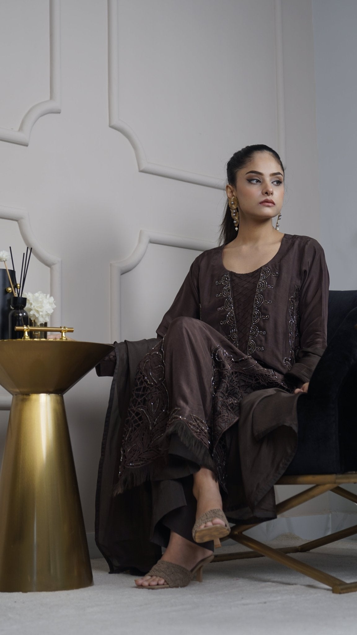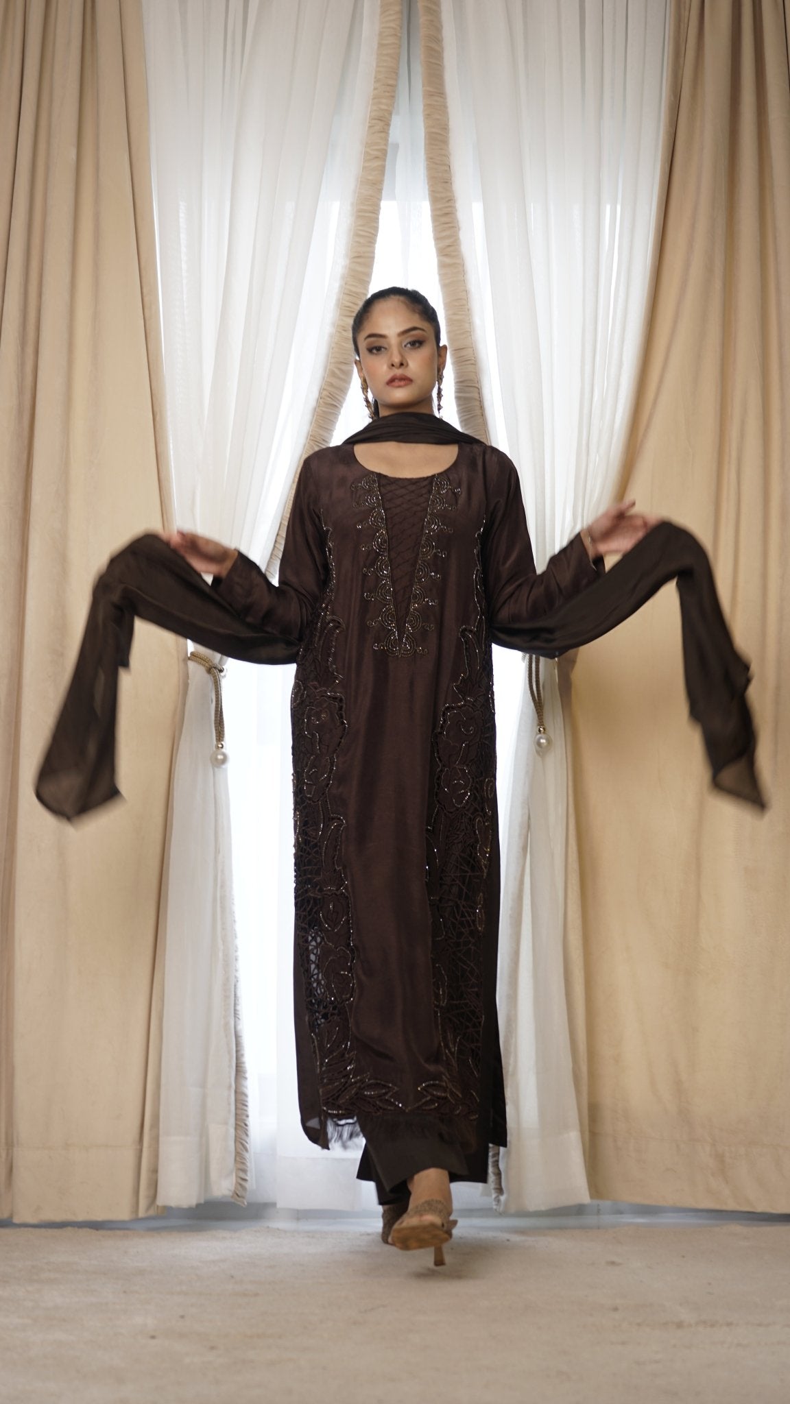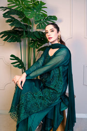 Jade green silk long kameez with exquisite cutwork & crystal work, tailored silk culottes, and a flowing silk dupatta.