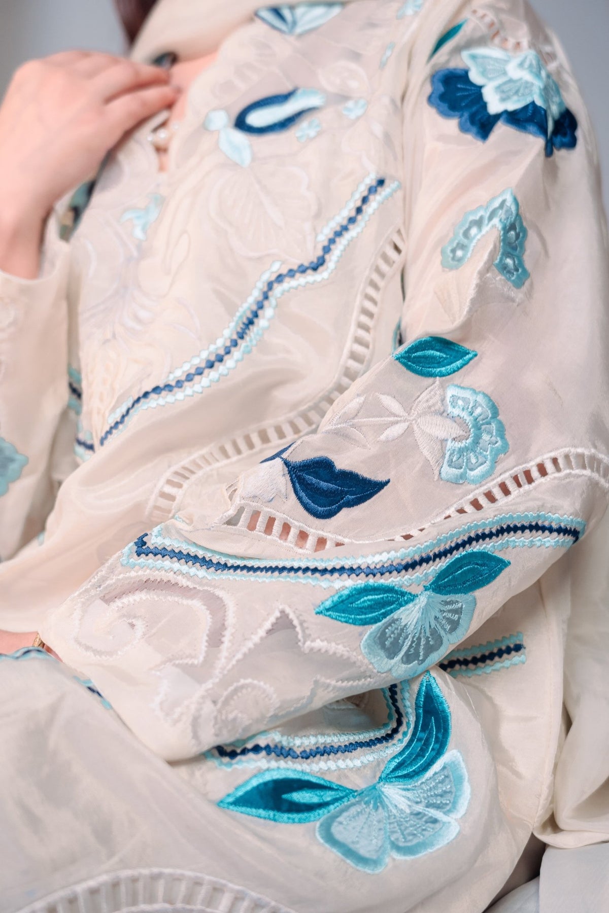 Pristine white silk shirt with organza cutwork & two-tone blue embroidery, classic white trousers, and matching white dupatta.