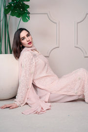 Elevate your festive and formal look with this baby pink tussle silk shirt, beautifully adorned with intricate embroidery and elegant pearl handwork. The soft hue combined with fine detailing adds a graceful and luxurious appeal, making it perfect for special occasions.