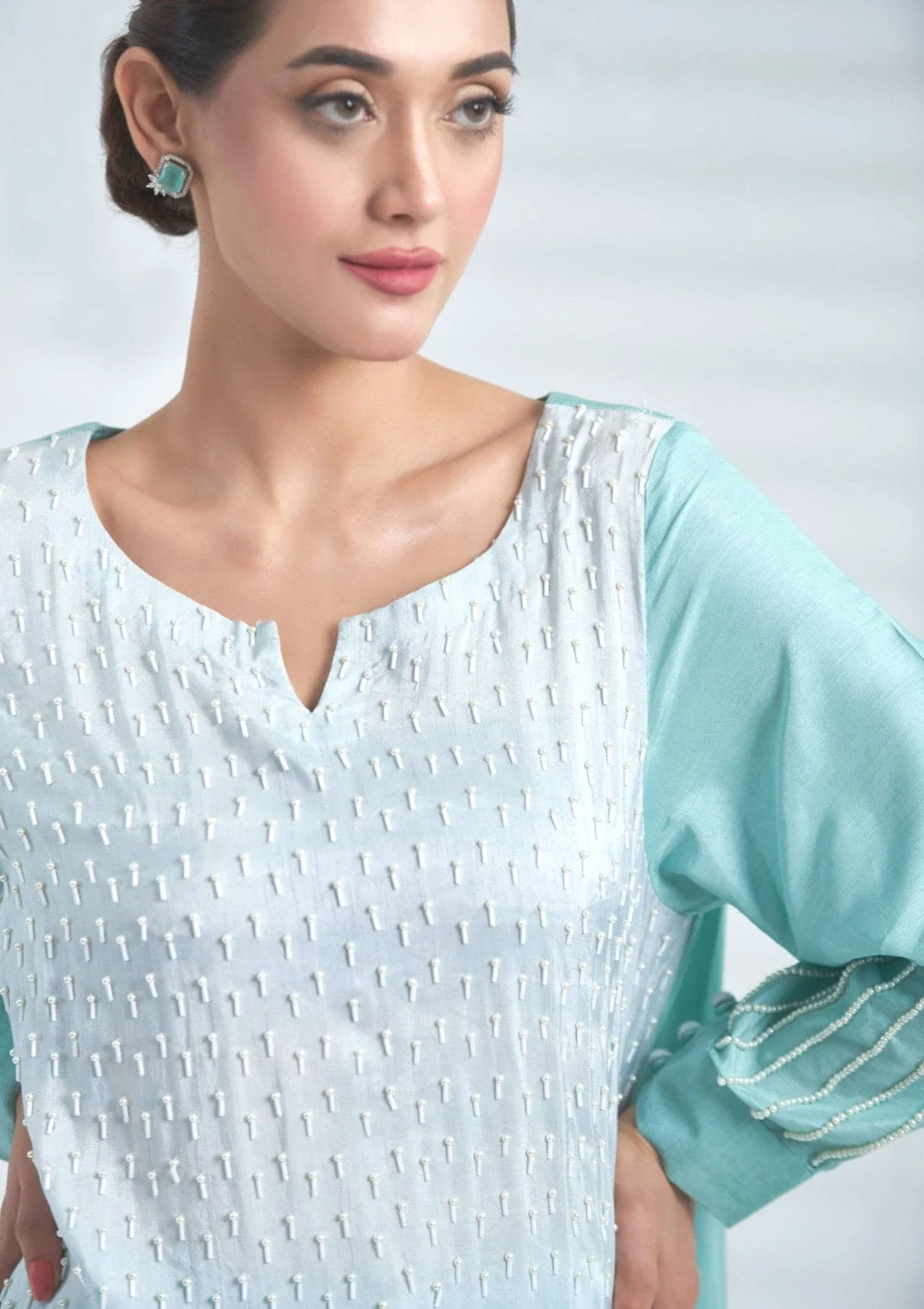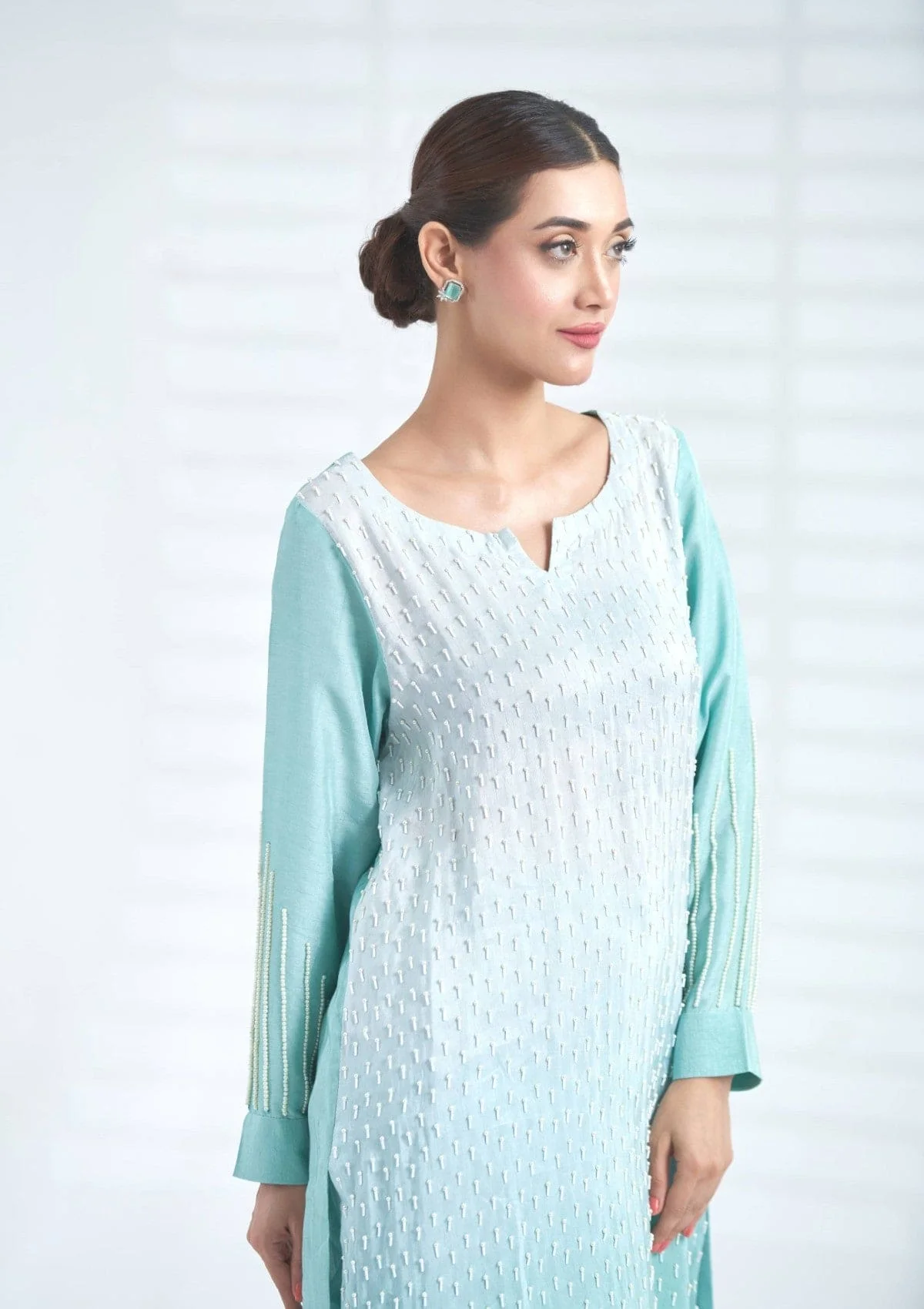 La Pearla is an ice blue ombre two-piece co-ord embellished with pearls, cutting pipes and Plain viscose lose pants. Shirt: Korean Raw silk Trouser: Lose viscose pants Other details: Color: Sky Blue