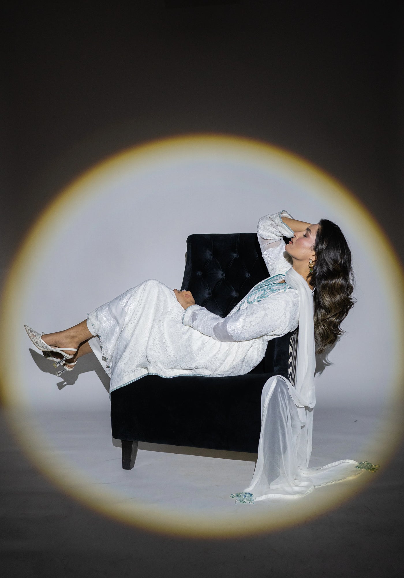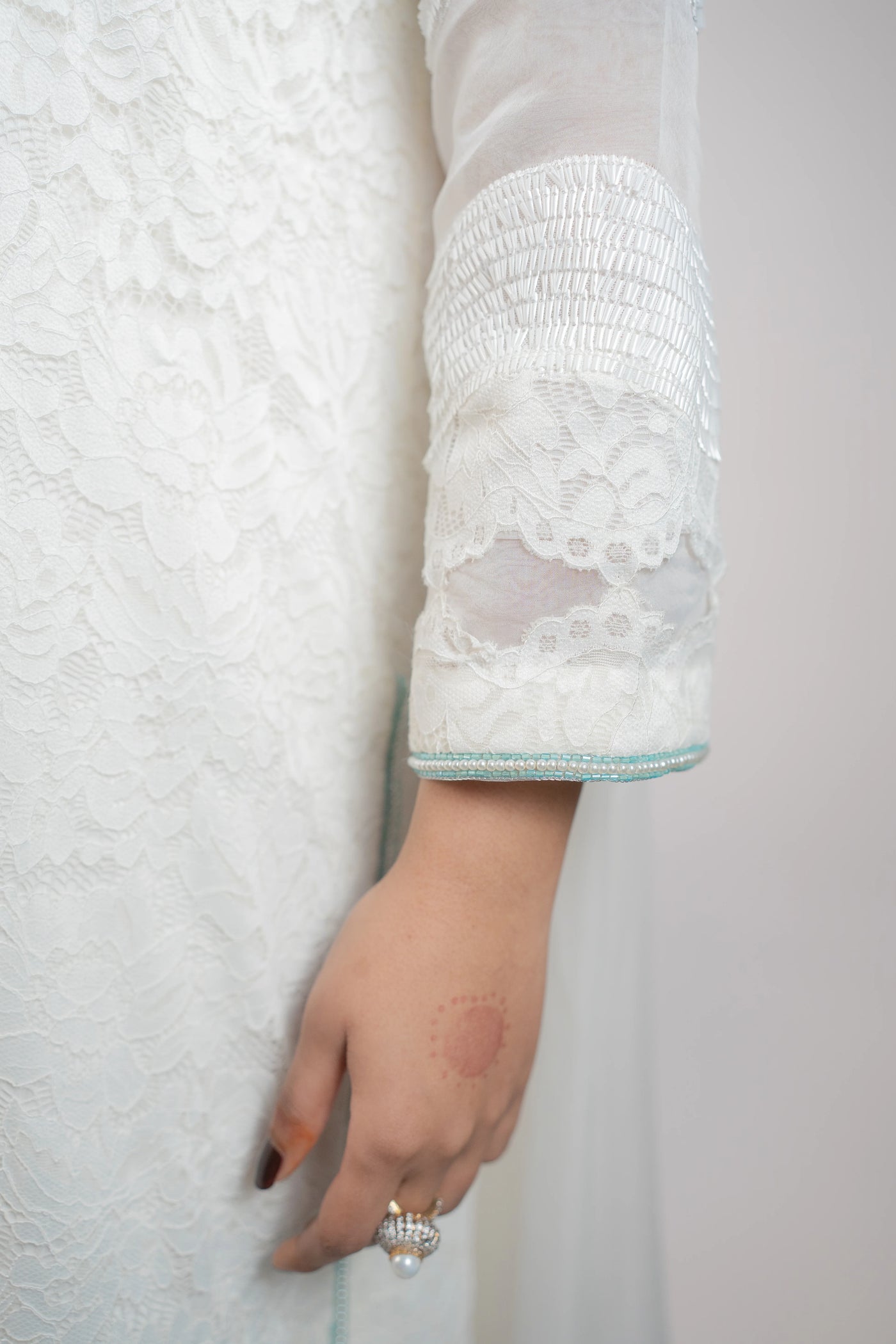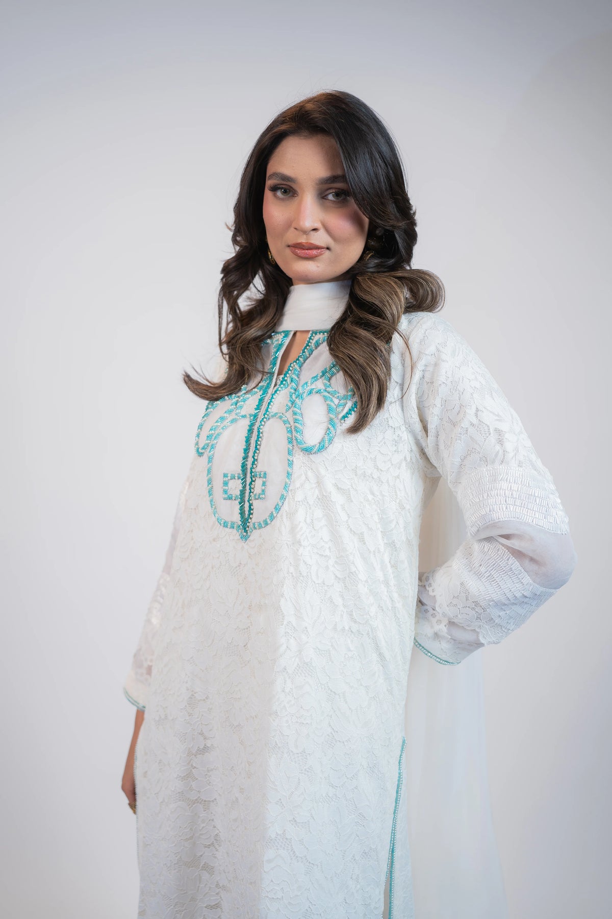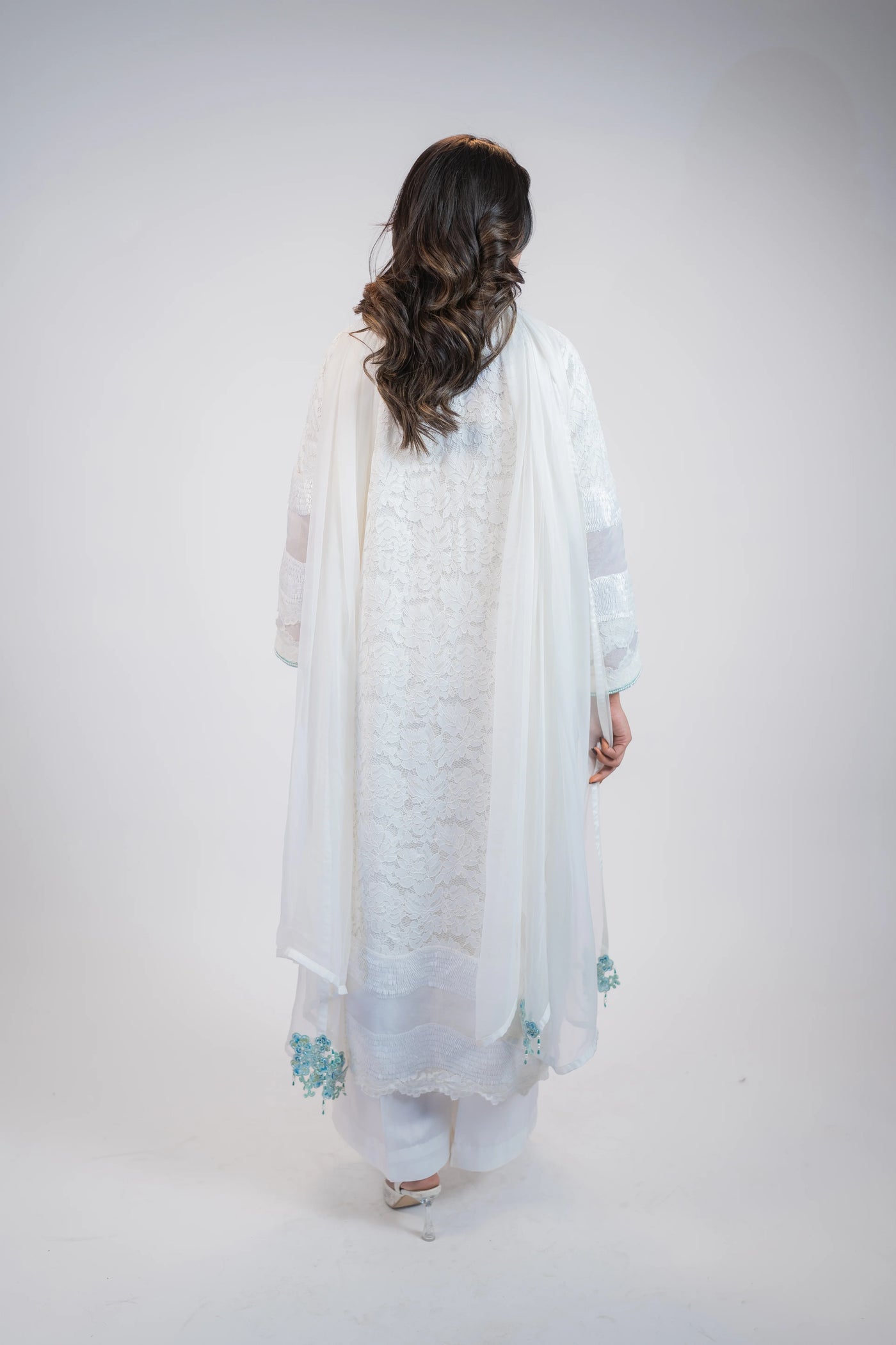 Exude timeless sophistication in this pristine white Chantelle 3PC dress, designed with refined elegance and delicate craftsmanship. The neckline is beautifully embellished with intricate firoza work, adding a soft yet striking touch of color and sophistication.