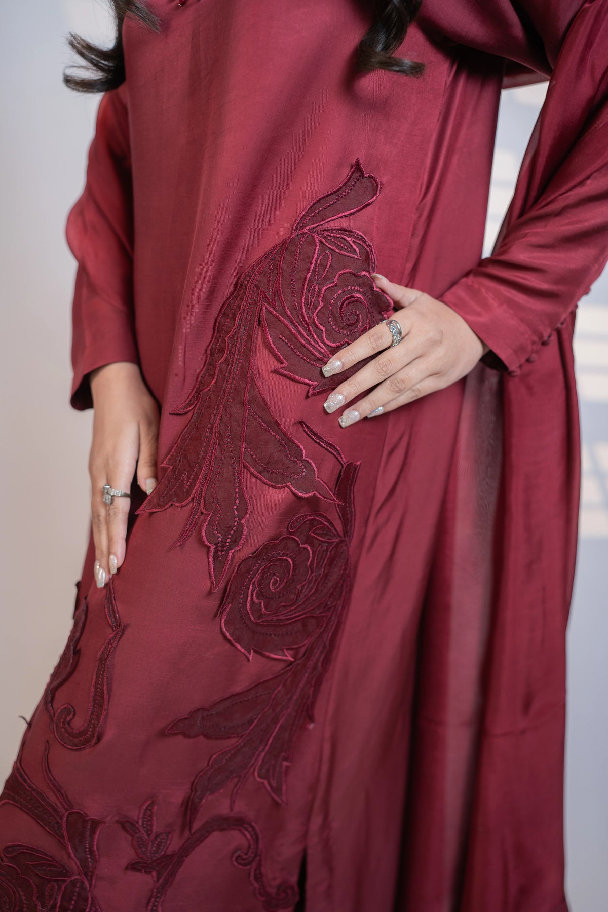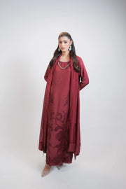 Turn heads in this luxurious red silk 3PC dress, designed to make a bold and elegant statement. The neckline is beautifully adorned with exquisite silver and ruby-toned necklace-style embellishments, creating a regal and eye-catching focal point